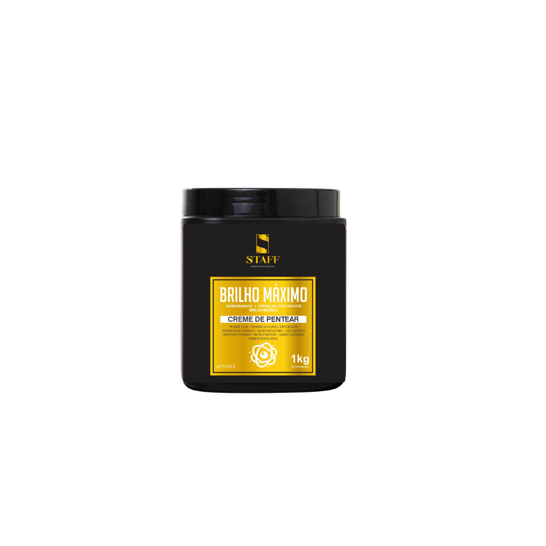 O Creme de Pentear BRILHO MÁXIMO STAFF PROFESSIONAL hidrata e nutre profundamente. Proporcionando maciez e intensificando o brilho natural dos fios. Desembaraça, condiciona, hidrata os fios, define e disciplina os cachos.