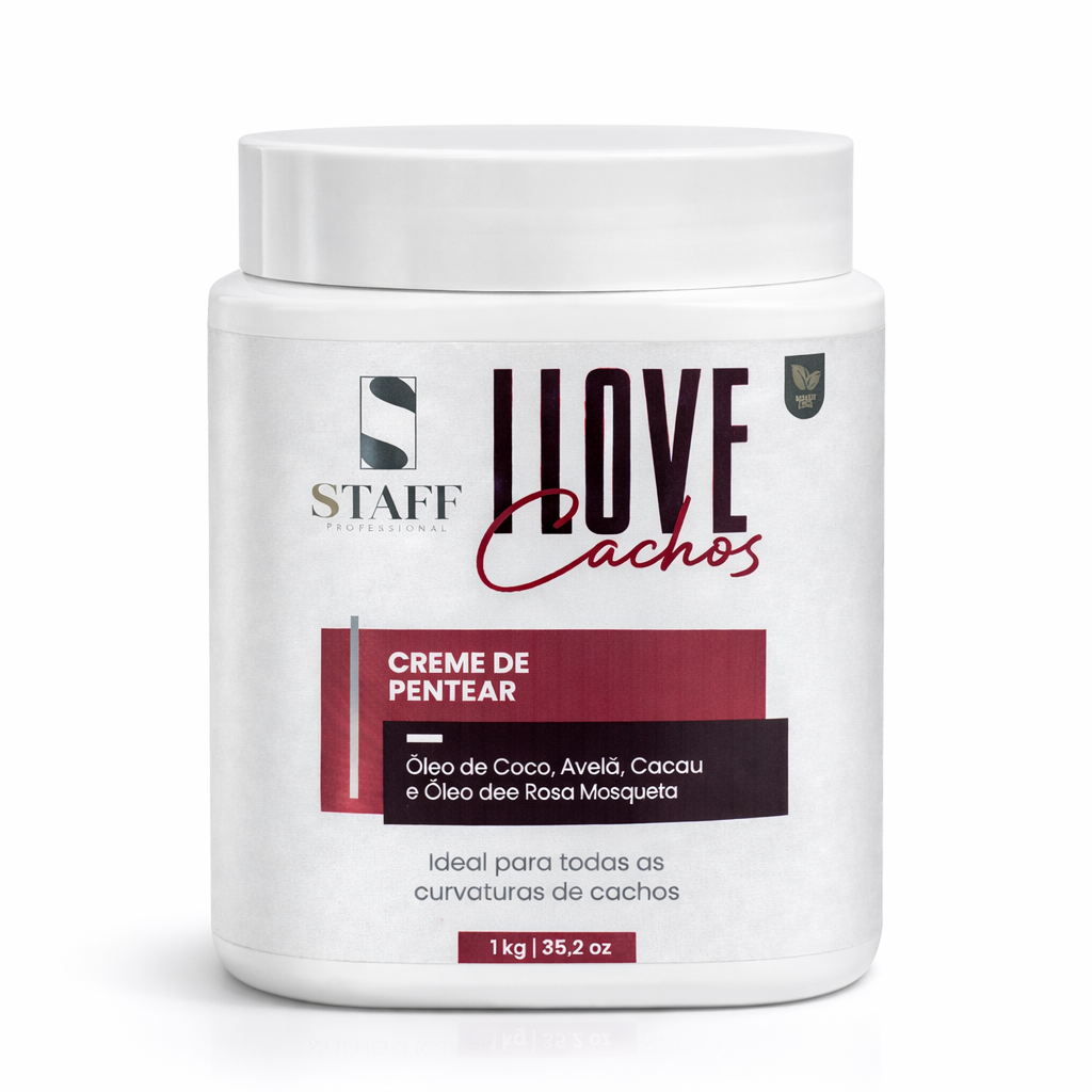 Creme de pentearI LOVE CACHOS STAFF VEGAN, cachos definidos, hidratados, macios, com brilho e vida. Enriquecido com óleo de coco, avelã, cacau e rosa mosqueta para quem ama cuidar e tratar dos seus cachos.